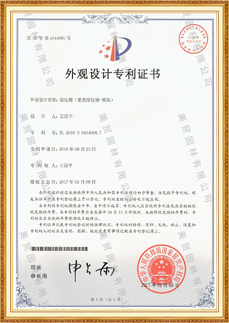 有限公司荣获多项专利及证书,包括外观设计,园林设计,产品设计等,产品经过国家质监局检测合格发放质检合格证书。
